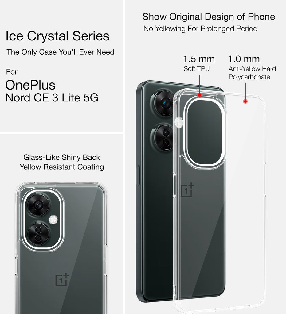 Ice Crystal Series Hybrid Transparent PC Military Grade TPU Back Cover for OnePlus Nord CE 3 Lite 5G, 6.72 inch, Crystal Clear