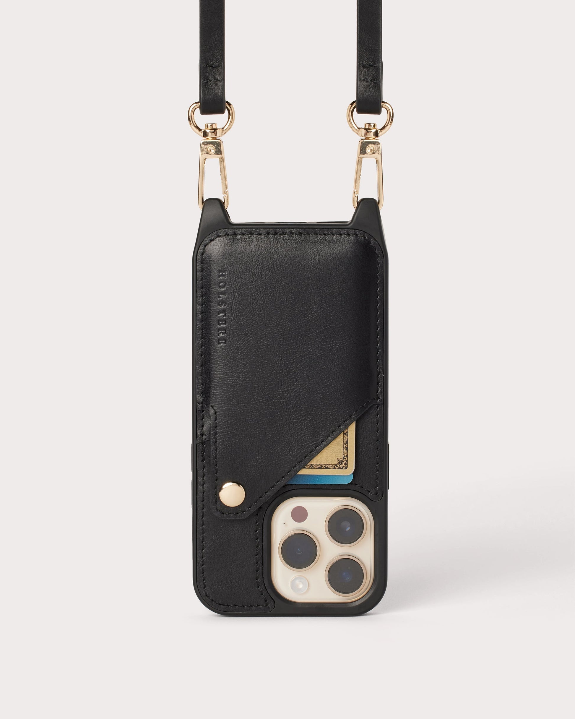 High-quality genuine smooth leather. Feels refined and durable to the touch and looks stunning with any outfit. Snap-on fully wrap-around fitted protective phone case in black. Wallet card holder with secure snap-shut button is designed to fit 2-3 cards. All hardware (clasps, button) is in gold-toned color.